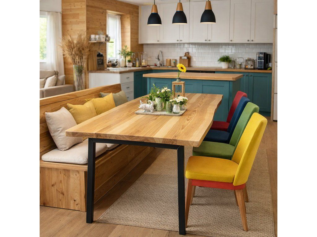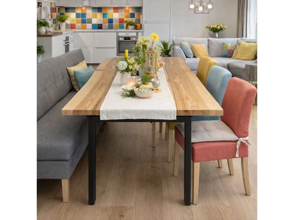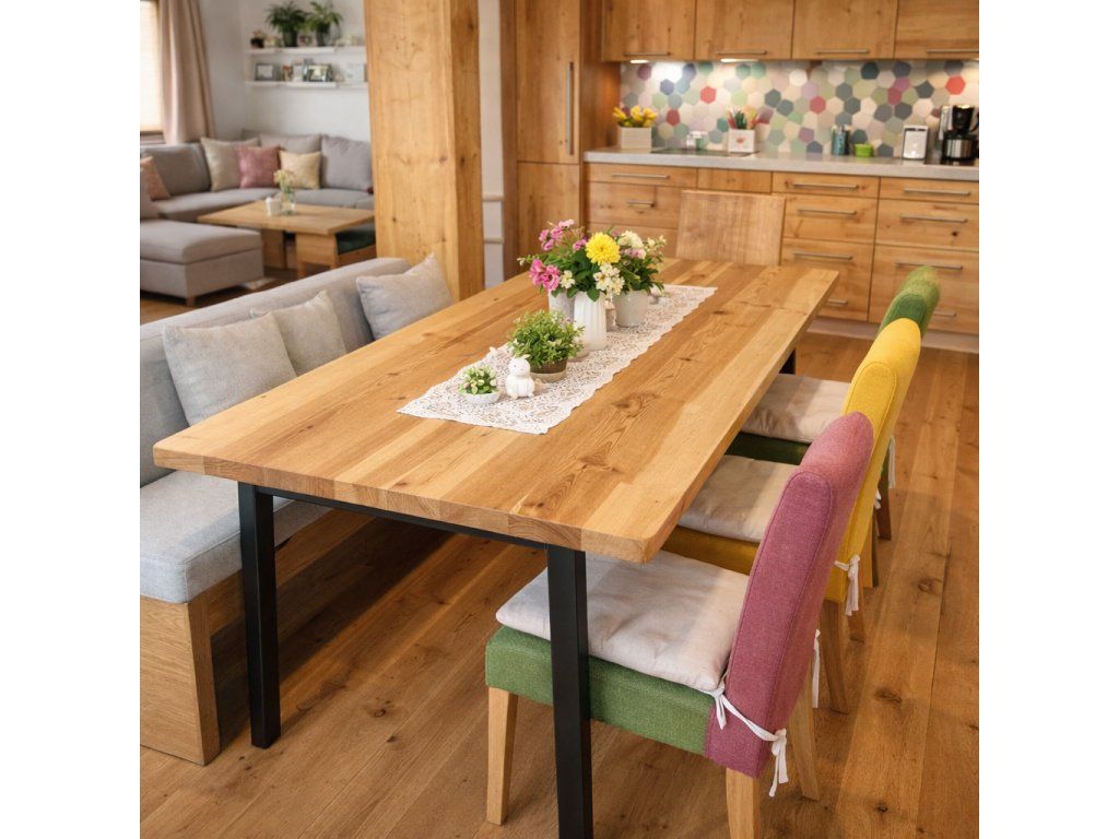 Stůl David se pyšní vrchní deskou z masivu o tloušťce 4 cm, ošetřenou tvrdým voskovým olejem, který zvýrazňuje přirozenou kresbu dřeva a zároveň chrání povrch při každodenním používání..