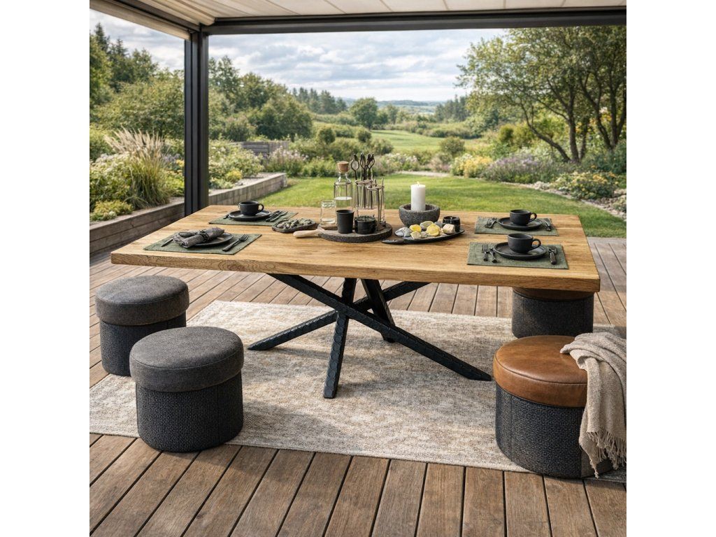 Stůl na prezentovaném obrázku má rozměry 200 × 90 cm, ale lze jej objednat v jiných velikostech i s volitelnými úpravami: hladký povrch, kartáčování, tesání, černý tmel nebo varianta bez suků – nasaditelný vzhled přesně podle vás