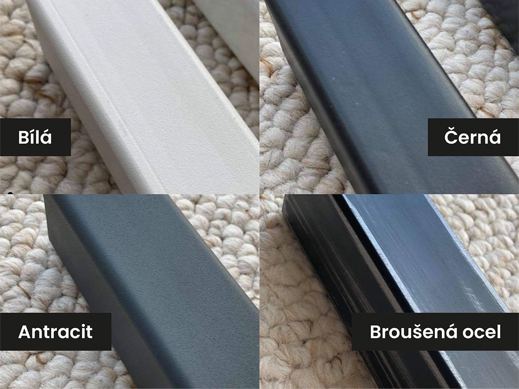 Kovová konstrukce s profilem 30×30 mm, dostupná v barvách jako bílá, černá, antracit či broušená ocel, zajistí pevnost a stylový industriální prvek.